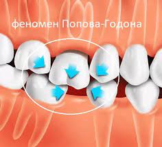 Феномен Попова-Годона возникает, когда зуб или зубы теряются, а оставшиеся зубы смещаются в сторону беззубого пространства. Важно понимать влияние щели на оставшийся зубной ряд. В целом признается, что пациенту нужно иметь только от 5 до 5 неповрежденных зубов в обеих дугах, чтобы иметь возможность функционировать и адекватно питаться.